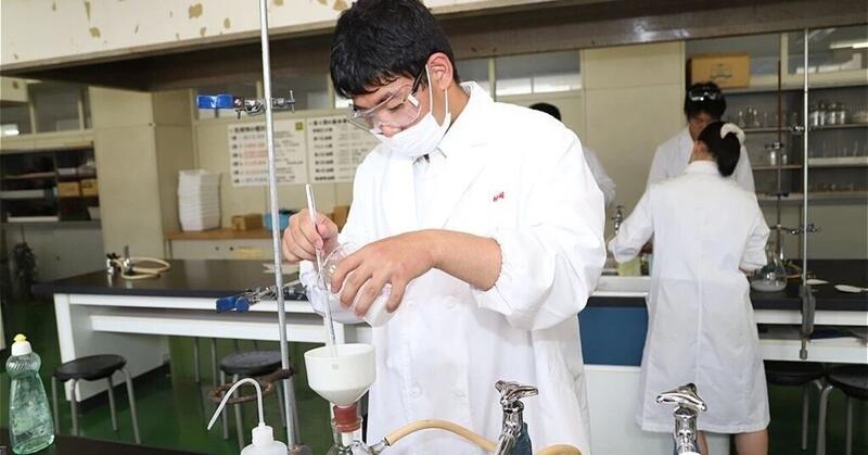 「工業化学科」は、スーパーマーケットなどに置かれる食品や調味料、洗剤、トレイやスポンジ、さらに生活に欠かせない油、ガソリンの製油、精製など身近なものに関わる分析、実験などを勉強をしています。