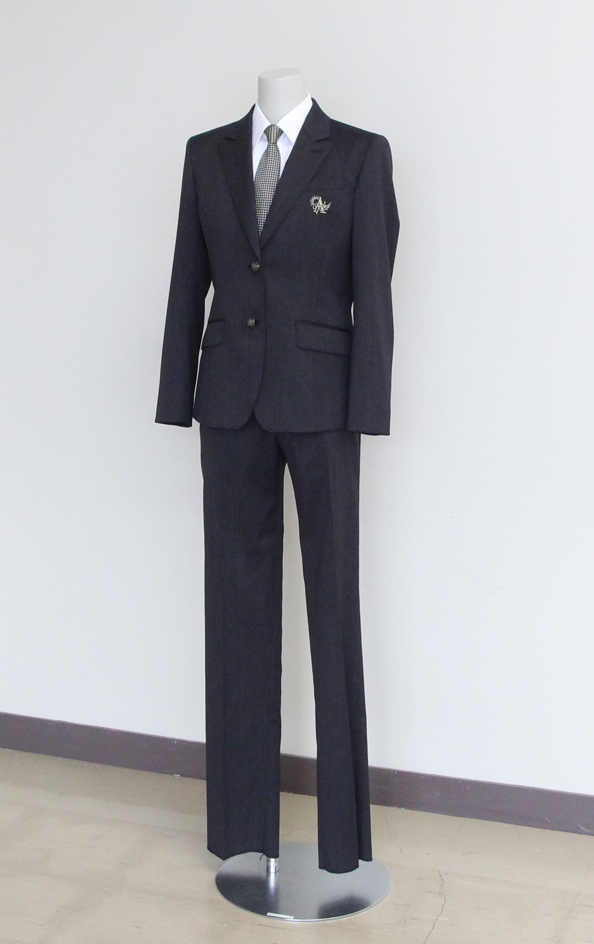 (1) 男女共通のデザイン(色は、グレー・紺・エンジの3色混ぜ)のスーツタイプ