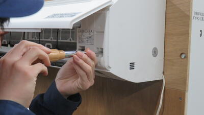 エアコンを運転させ、無事に冷気が出できました!エアコンが正常に稼働した瞬間、生徒は達成感を感じていました。